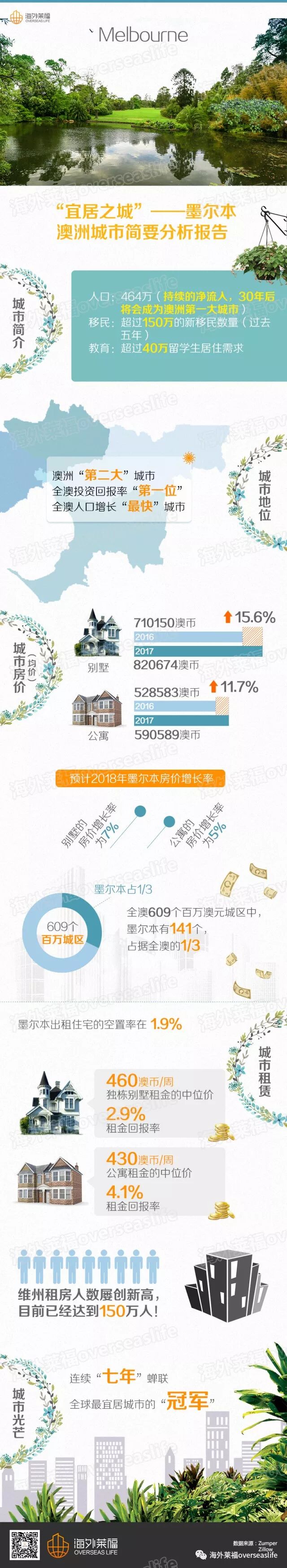 Melbourne 近年来,澳洲房产市场持续大热,其中又要以墨尔本市场为海外投资者的最爱。截止日前,墨尔本的房产价值增长速度已经超过悉尼,成为澳洲房价增长最快的城市。 而在海外投资的过程中,除了坐等房价增长房产增值,出租房产也是非常重要的课题,租房市场和房产买卖市场同样火热。 墨 尔本(Melbourne),澳大利亚第二大城市及维多利亚州首府,世界著名的旅游城市,连续多年被评为全世界最适宜居住的城市。有“澳大利亚文化之都”的美誉,也是国际闻名的时尚之都。 很多人选择去墨尔本买房,为什么墨尔本房产那么受欢迎?今天我们一探究竟,为何投资者的目光都在紧盯墨尔本。 全球最宜居城市 基础设施建设加速升级 在澳大利亚的首府城市中,墨尔本向来以其优质的生活品质闻名于世,尤其2017年连续七年蝉联经济学人智库(The EIU)“全球最宜居城市”,在全球近150个城市中,墨尔本凭借综合评分97.5的高分脱颖而出,其中医疗、教育和基础设施获得了满分。 现在墨尔本人口以每周将近2000人的速度快速增长,据专家预测,这部分新增人口为墨尔本房产市场和租房市场带了了巨大需求。 一个城市的规划必将影响房价,基础设施完善的城市未来定能收获可观的增值收益。 墨尔本正在大刀阔斧地新建第三个机场,火车站,地铁等。政府制定的《大墨尔本发展计划》提到,到2050年,致力于将墨尔本建设成澳洲最大的商业和住宅中心——在墨尔本大都市范围内:新建6大就业集群、新增580万平方米的购物商城、600万平方米的写字楼、新增工作岗位近170万。 人口增长领跑全澳 房屋供不应求 人口数量是维系房地产的刚性因素,一个地区/城市的人口规模将对该地房地产的发展起决定性作用。 在过去的12个月里,墨尔本的人口增长速度达到了2.1%,这一增速领先全澳,根据澳大利亚统计局的可靠预测,到2035年,它的人口将会增长到800万,到那时,它的人口总数将超过悉尼。 人口增长带来庞大的住房需求,与此同时维州的新公寓、联排别墅等批准量下降,牛津经济研究所BIS预测,维州公寓动工量也将从2015年的19,800套顶峰水平下降到2021年的7200套低位。墨尔本人口增长呈爆炸式,房市将面临供不应求局面。 留学生市场潜力大 租房需求强劲 墨尔本的宜居声名在外,其教育水准同样享誉全球。被评为"全球第二佳求学城市",墨尔本大学、莫纳什大学均在世界百强大学榜上,而在世界最佳留学城市排行榜中,墨尔本更是位列澳洲榜首。高水平的教育加上宜居的环境,是海外学生留学的不二选择。 留学生的存在,也是构成房地产投资回报的一个重要组成,留学生的高租房需求,为房产投资者提供了稳定的现金回流。 房价上涨 三分之一地区跻身“百万俱乐部” 虽然今年7月1日开始维州实施了房产新政,但也阻止不了墨尔本房价上涨的“脚步”。CoreLogic数据显示,在澳洲的609个百万澳元城区中,墨尔本现阶段已经有三分之一的区(141个区)跻身其列。而在5年前,墨尔本的百万澳元城区还只有30个。 CoreLogic的最新房价报告也显示,今年9月份墨尔本的房价中位值约为$70.3万澳元。在过去一年中,墨尔本的房价上涨了12.1%,全澳排名第二。 房屋拍卖成交率强劲 维持近80%水平 房产拍卖结果是观察房地产市场的一项有效参考,从本质上讲,清盘率是拍卖市场供给及需求状况的写照,是反应市场预期表现的首要指标。清盘率越高,说明房产越容易被卖出。 目前墨尔本二手房拍卖市场持续火爆,据澳洲权威地产网站Domain报道,上周六(10月28日)墨尔本的清空率达72%,房屋中位价达$88.8万,反之,悉尼清空率仅为65%,房价中位数达$131万。此次墨尔本的拍卖结果同样让大多数卖家感到惊喜。 房屋空置率低于全国水平 租房需求大 墨尔本每年吸引了非常多的海外人士来学习、工作或旅游,因此租房需求也随之增加。特别是学校附近,租房市场竞争更是十分激烈。SQM Research的数据显示,截止到今年9月份,墨尔本房屋空置率仅为1.9% 。与此同时,墨尔本的公寓租金价格在2017年上涨了4.5%。 另据澳洲人口普查数据显示,2006年至2016年期间,维多利亚州租房者人数增长了34万人,近90%地区都迎来了租房者人数的增长。墨尔本作为维多利亚州首府城市,租赁市场迎来黄金期。 作为澳洲首府城市之一,墨尔本房产市场经历百余年的发展,已相当稳定成熟,过去40余年,房价租金按照一定规律稳健上涨,利于长期资产升值保值,是投资人士的优质选择。 海外莱福海外房产管理业务在澳洲市场已具备相当成熟的运营规模,房屋出租管理、日常维修维护、房屋转售管理方面已开拓出一系列完整的服务流程。将房产委托给海外莱福管理,是您的不二选择。